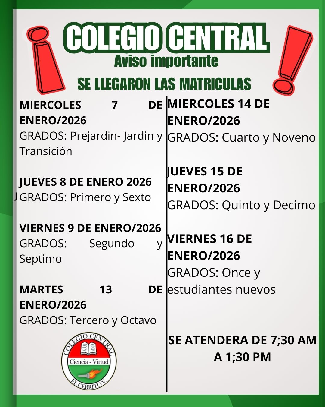 Las matriculas del 6 de diciembre hasta el 14 de diciembre, están programadas por grados....