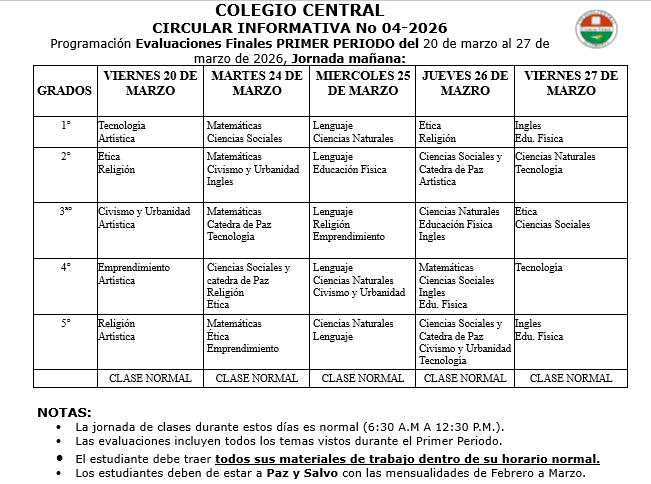 Cronograma evaluaciones finales Primer Periodo Primaria